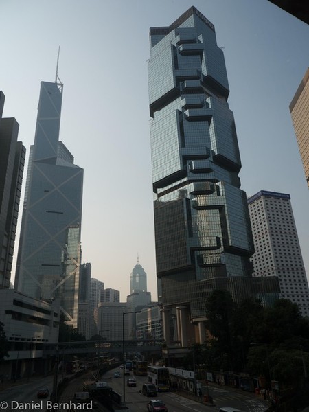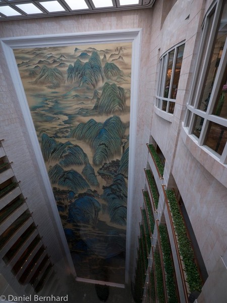 In einem Schnellrestaurant aßen wir eine Kleinigkeit, bevor wir uns mit der Reiseleiterin Conny auf eine optionale Tour durch Hongkong begaben. Ganz entspannt begann unsere Tour mit der alten Westbound-Straßenbahn (im oberen Stock), führte zu Fuß durch den Financial District, den Hongkong-Park und den Cheung Kong-Park. Speziell war der Besuch des Shangri La Island Hotel (riesiger Seidenwandteppich, toller Blick vom 56. Stockwerk auf die Stadt).