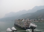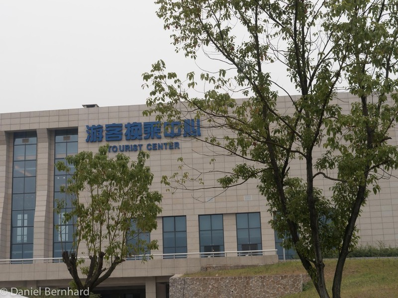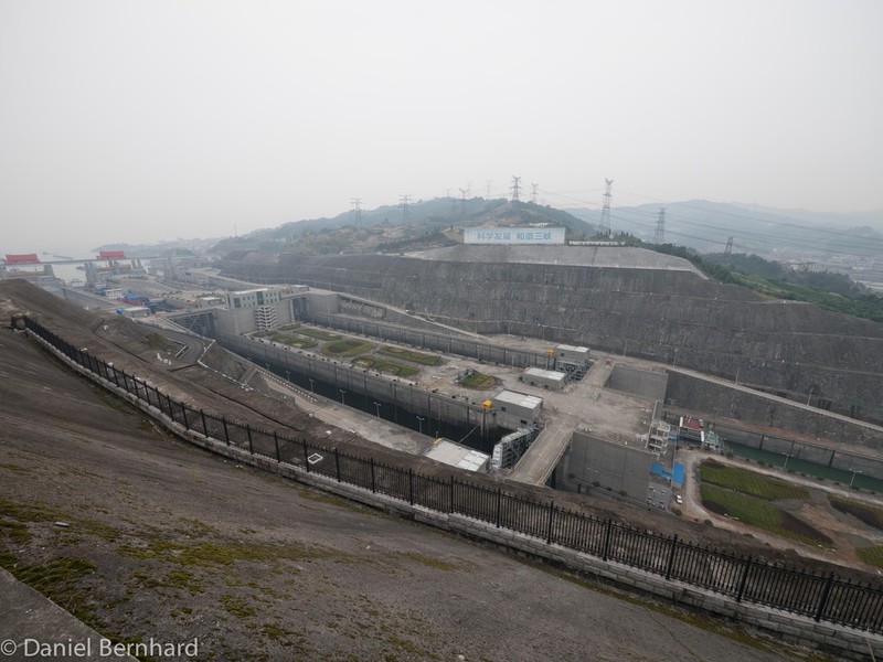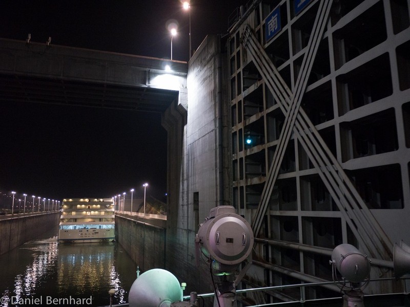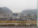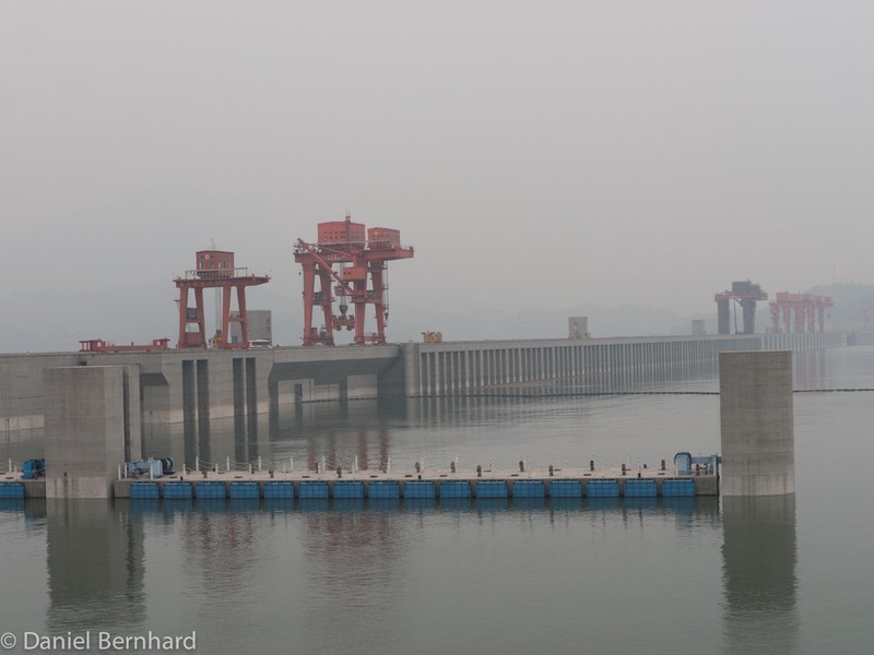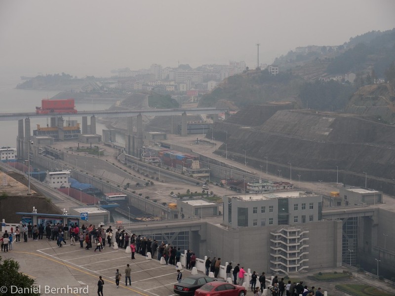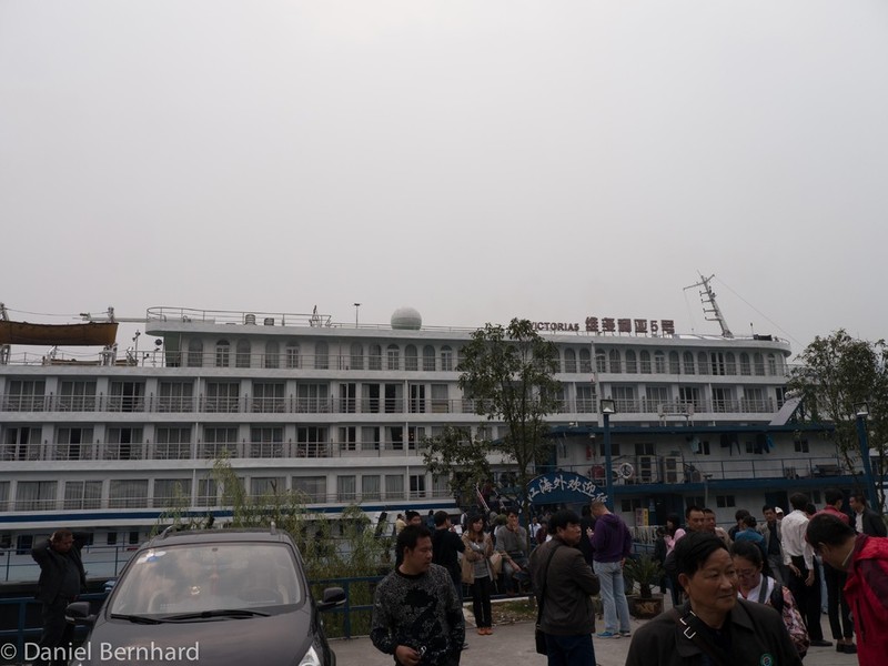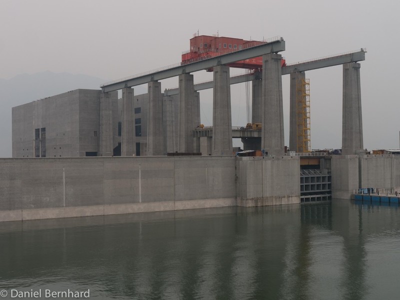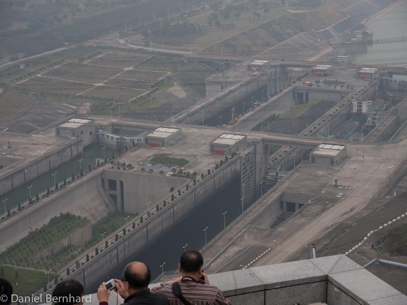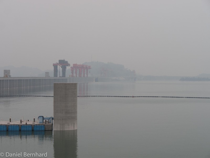 ... Schleuse 2, Schleuse 3, Schleuse 4, Schleuse 5 und dann die Ausfahrt und Anlegen des Schiffs - wir gingen um 3:00h wieder ins Bett. Doch um 6:00h klingelte der Wecker schon wieder - raus aus dem Bett und frühstücken, denn um 7:30h ging es mit dem Bus zum neuen Staudamm. Von dort kamen wir gegen 11:00h zurück und das Schiff legte wieder ab - gegen 11:30h durchfuhren wir die Xiling-Schlucht und legten dann um 13:00h in Yichang an. Die Anlegestelle ist ziemlich chaotisch (wenig Platz, viele Touristen, fliegende Händler, arme Gepäckträger, nur einspurige abenteurliche Zufahrt) - mit dem Bus erfolgte die Fahrt zum Mittagessen in der Stadt.