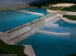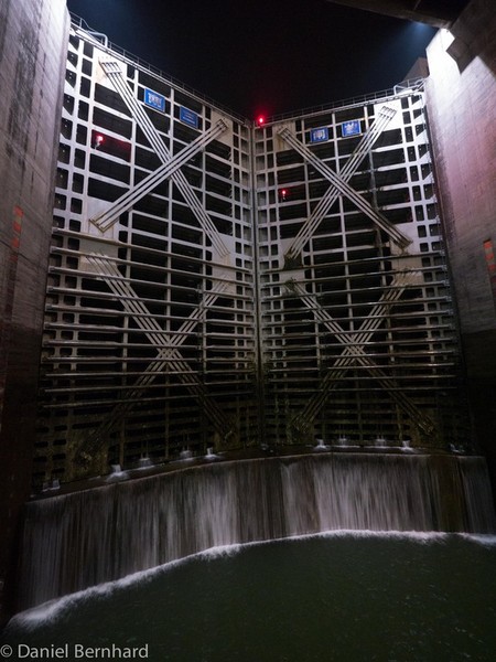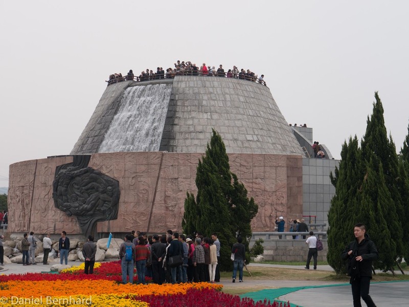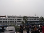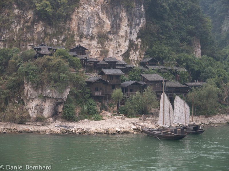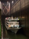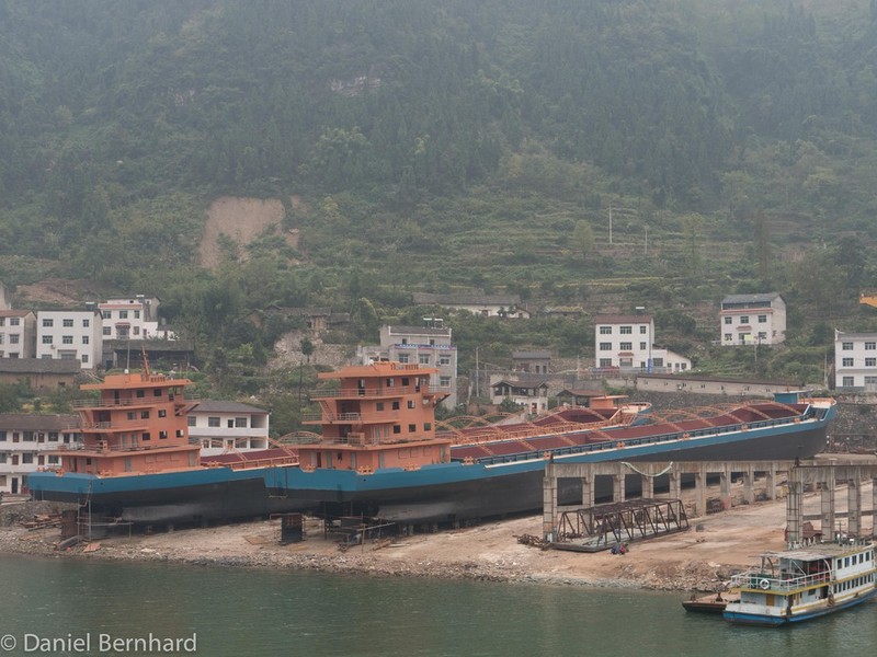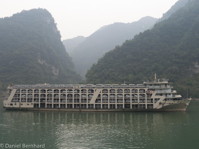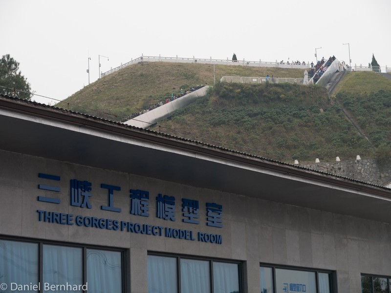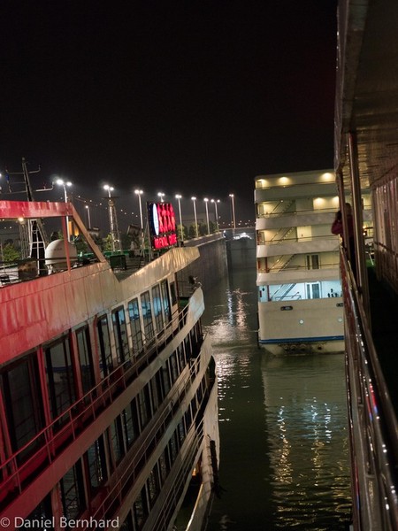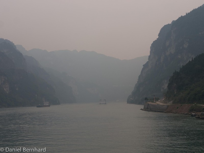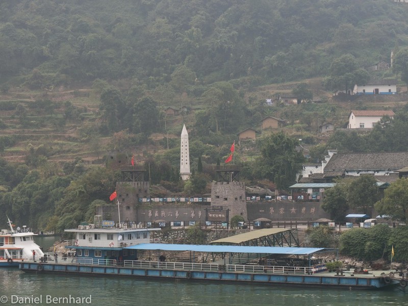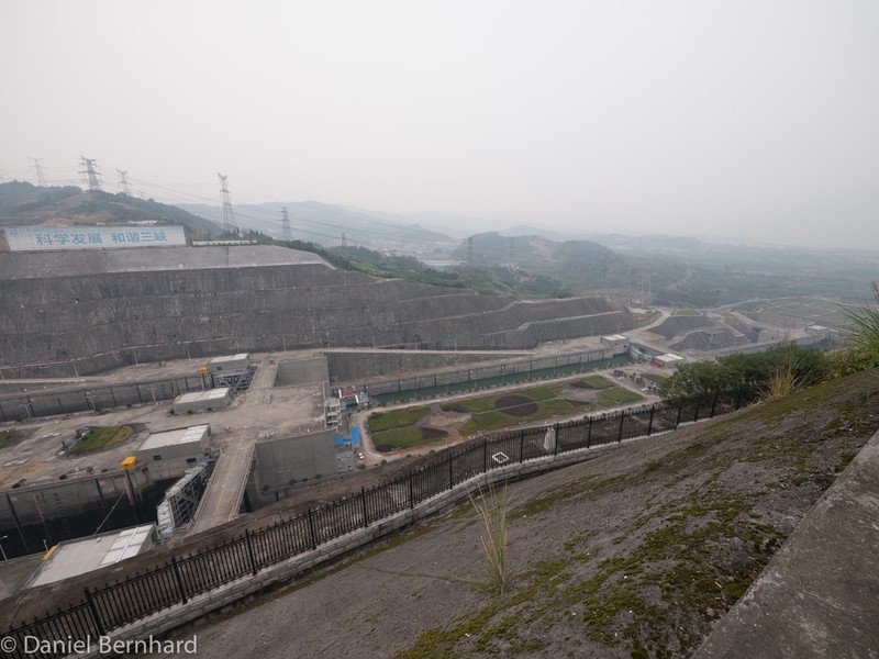 ... Schleuse 2, Schleuse 3, Schleuse 4, Schleuse 5 und dann die Ausfahrt und Anlegen des Schiffs - wir gingen um 3:00h wieder ins Bett. Doch um 6:00h klingelte der Wecker schon wieder - raus aus dem Bett und frühstücken, denn um 7:30h ging es mit dem Bus zum neuen Staudamm. Von dort kamen wir gegen 11:00h zurück und das Schiff legte wieder ab - gegen 11:30h durchfuhren wir die Xiling-Schlucht und legten dann um 13:00h in Yichang an. Die Anlegestelle ist ziemlich chaotisch (wenig Platz, viele Touristen, fliegende Händler, arme Gepäckträger, nur einspurige abenteurliche Zufahrt) - mit dem Bus erfolgte die Fahrt zum Mittagessen in der Stadt.